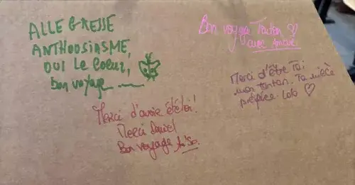 Ces quelques messages parmi tant d’autres, illustrés de bateaux, d’arbres, de cœurs et de nez de clowns, étaient autant d’épitaphes éphémères écrites par ses proches sur le cercueil en carton de Daniel. Comme souvent dans les cérémonies organisées par Syprès, un « geste » est ainsi proposé à l’assistance pour que tous participent aux adieux. Au-delà des messages et des dessins, il y avait également, prêtes à être collées sur le cercueil, des définitions, découpées dans un dictionnaire, choisies par ses proches.
