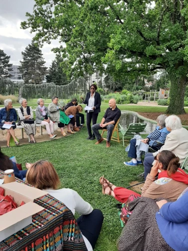 Cette visite a été l’occasion d’expliquer ce qu’est une coopérative funéraire aux personnes impliquées dans le projet poitevin : gouvernance démocratique, lucrativité limitée, nouvelle approche du funéraire… Nous nous sommes ensuite rendus au parc de la Roseraie afin d’animer avec Agnès une réunion publique. Le but était de faire connaître le projet aux habitant.e.s, et de commencer à constituer un collectif pour monter la coopérative ! Aurélien Tabuteau, maire de Plaisance dans la Vienne, est également venu parler du cimetière naturel qui a été créé dans la commune.
